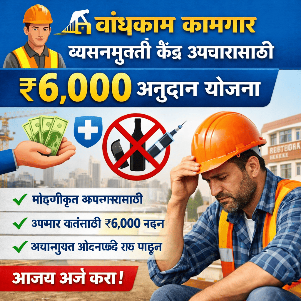 🏗️ बांधकाम कामगार व्यसनमुक्ती केंद्र उपचारासाठी ₹6,000 अनुदान योजना|