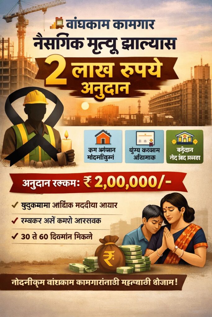 рдмрд╛рдВрдзрдХрд╛рдо рдХрд╛рдордЧрд╛рд░рд╛рдЪрд╛ рдиреИрд╕рд░реНрдЧрд┐рдХ рдореГрддреНрдпреВ рдЭрд╛рд▓реНрдпрд╛рд╕ рддреНрдпрд╛рдВрдЪреНрдпрд╛ рдХреБрдЯреБрдВрдмрд╛рд╕рд╛рдареА рд╣реА рдпреЛрдЬрдирд╛ рдореЛрдард╛ рдЖрдзрд╛рд░ рдард░рддреЗ. реи рд▓рд╛рдЦ рд░реБрдкрдпрд╛рдВрдЪреЗ рдЕрдиреБрджрд╛рди рд╣реЗ рдХреБрдЯреБрдВрдмрд╛рдЪреНрдпрд╛ рддрд╛рддреНрдХрд╛рд│ рдЧрд░рдЬрд╛ рднрд╛рдЧрд╡рдгреНрдпрд╛рд╕рд╛рдареА рдЦреВрдк рдЙрдкрдпреБрдХреНрдд рдард░рддреЗ.