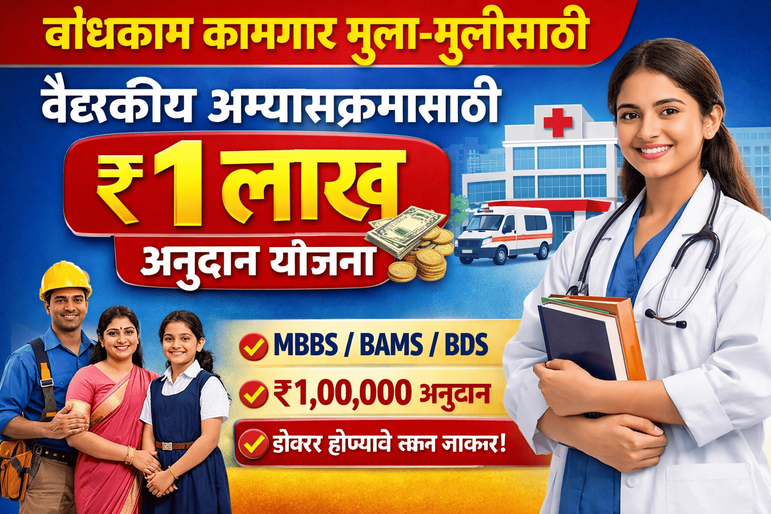 🏥 बांधकाम कामगार वैद्यकीय अभ्यासक्रमासाठी ₹1 लाख अनुदान योजना